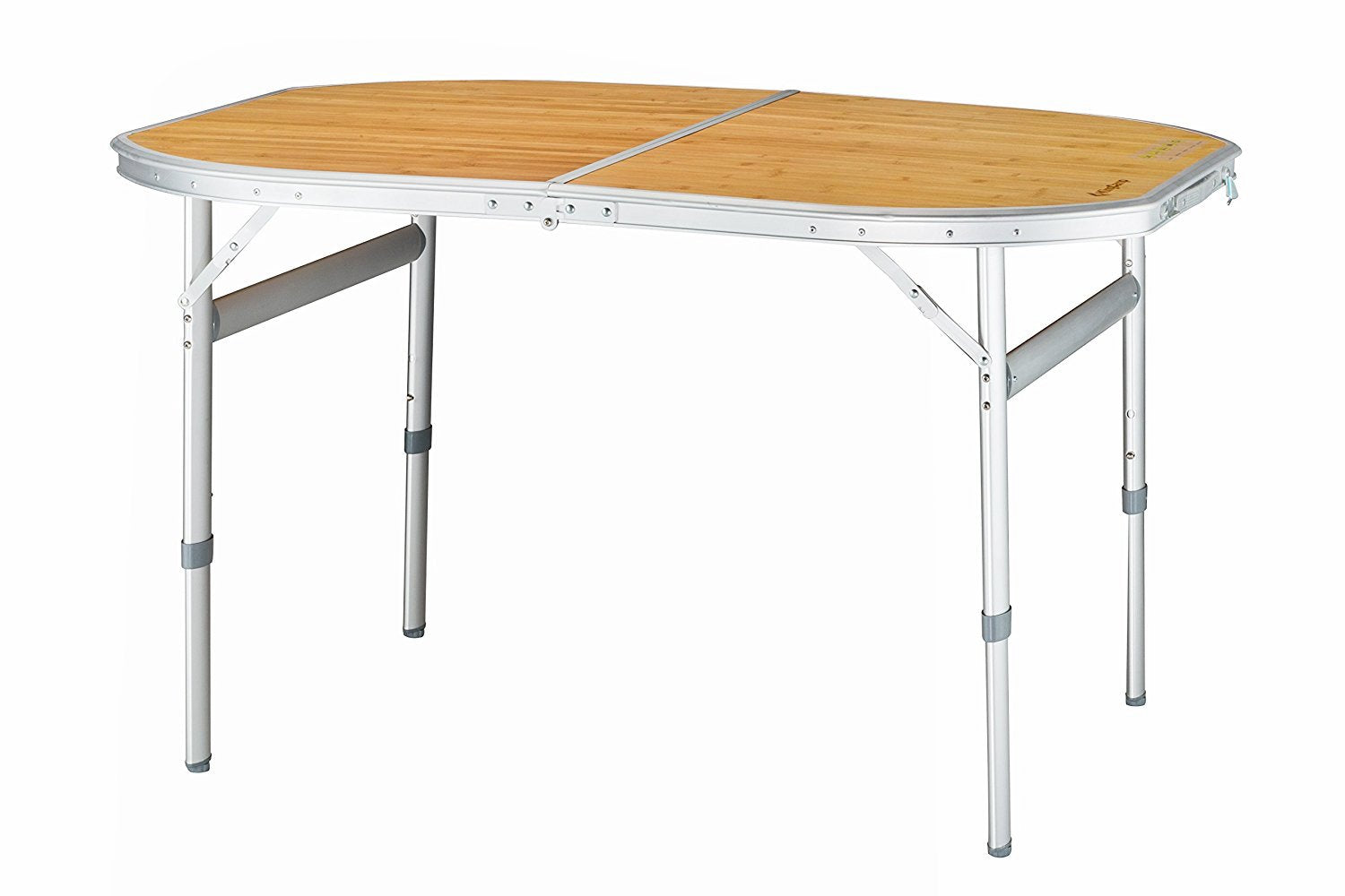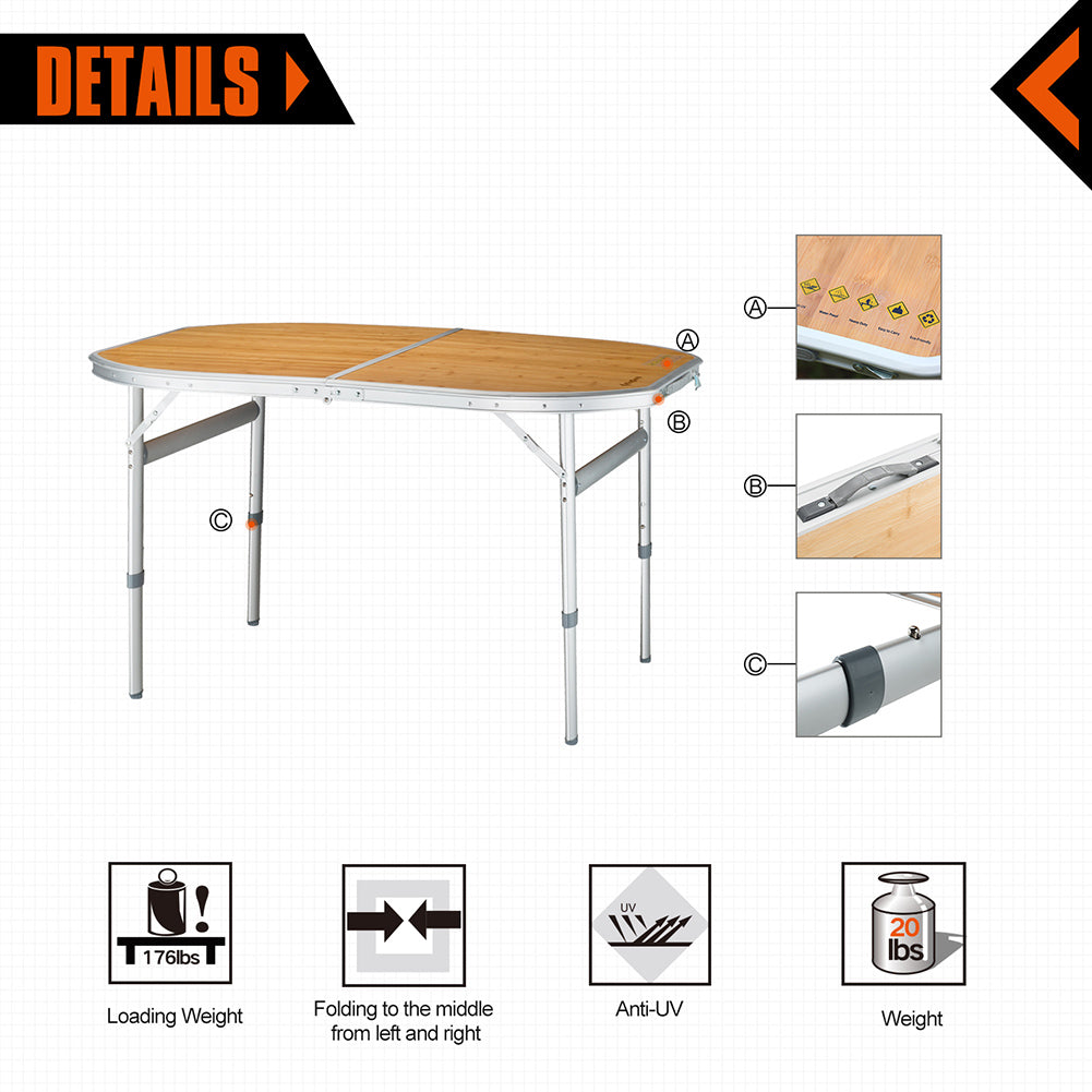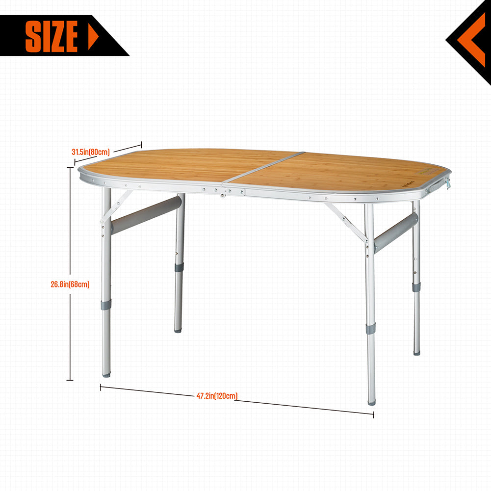 KingCamp multi-purpose lightweight portable strong stable bamboo folding table for 6 persons is perfect to be used indoor as a sofa table, or bring it to outdoor activities for picnic, camping, beach, patio parties, fishing, and more! The table leg can be adjusted into two heights, which can suit for the chairs of different height. The table board and the bracket adopt the split type design, aviation aluminum plate and the stent is folding, so it is easy to set up or fold in seconds when you need to use and store it at anytime. The desktop is made of aluminum alloy and anode oxidation treatment, no rust, corrosion resistance and easy to clean up. The table can be folded to the middle from left and right. The table only weight 20.3 lbs and after folded the size only has 31.9 × 25.2 × 3.5 inches. It is portable and light enough to be carried like a suitcase on a trip, fits most car trunks, satisfying your camping needs.