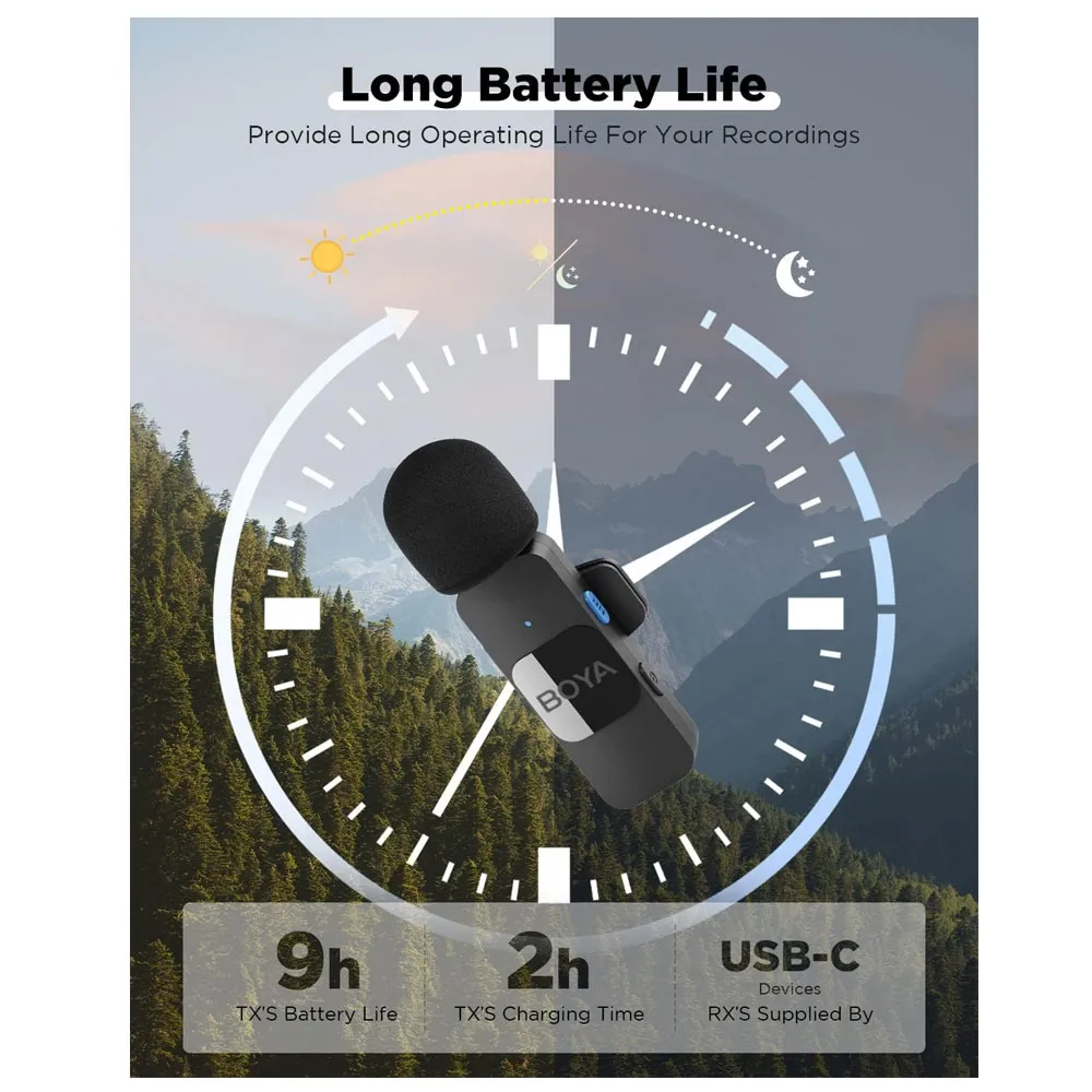 The battery life of this BY-V20 series is exceptional, the transmitter can work continuously for 9 hours after being fully charged, while the receiver does not need to be charged, completely eliminating the hassle of interrupting recording to charge the device and you can always remain on the GO.