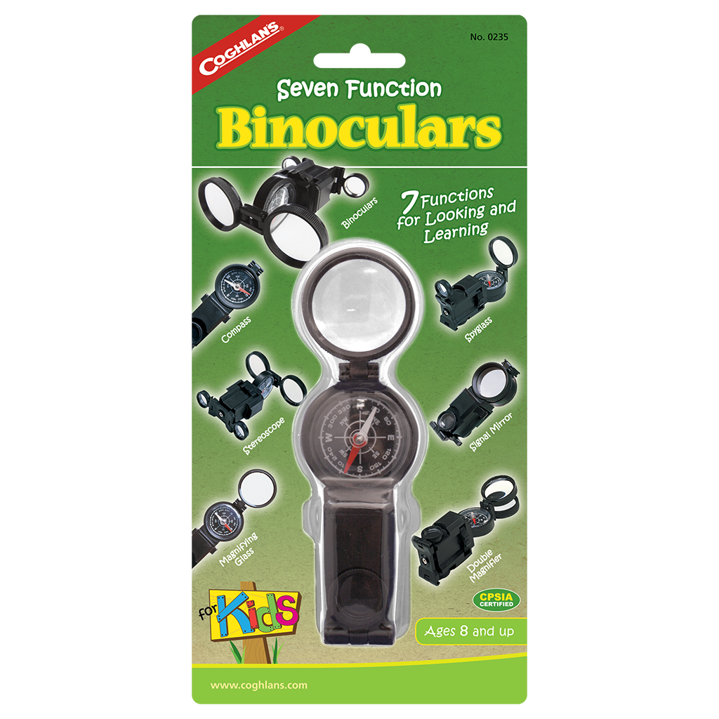 These feature seven separate functions for looking and learning: binoculars, monocular/spyglass, magnifier, compass, stereoscope and signal mirror. The binoculars can be adjusted with the thumbwheel.