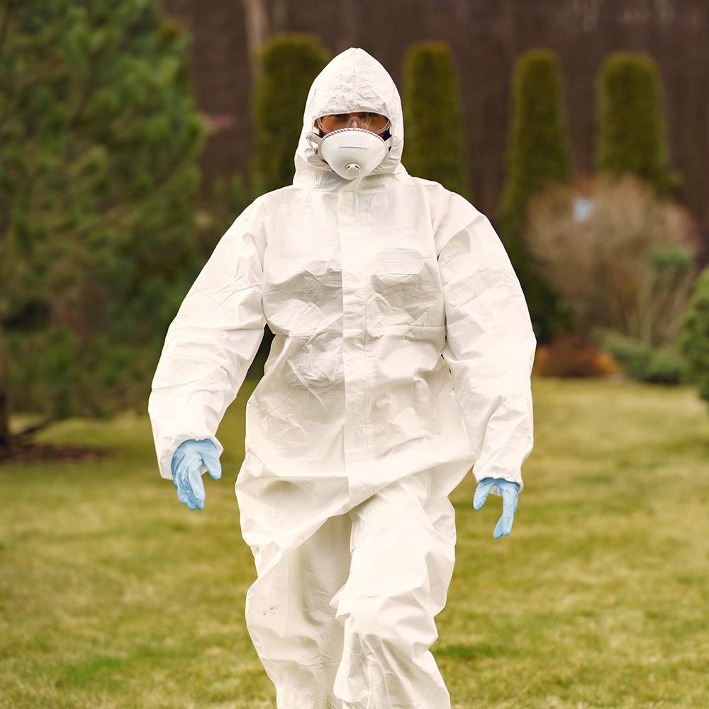To increase protection against dust and chemicals, the suit is hooded and has covered zipper.